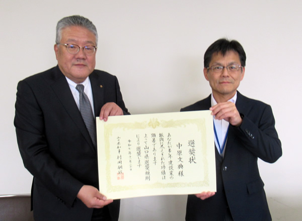 2026年1月14日 / 最終更新日時 : 2026年1月14日 サイト管理者 TOPICS 中原理事が県選奨を受賞されました(2025.11.20) 令和7年の山口県選奨において、「中原文典 山口県建築協会理事」が産業功労として山口県選奨を受賞されました。 中原文典氏は、平成22年から山口県建築協会の理事に就任し、以後現在まで8期15年にわたり理事を務められています。 建築業界では、県内の中核組織である同建築協会の事業促進と堅実な運営のために、様々な懸案事項に先頭に立って積極的に取り組んできてこられました。 この度は、誠におめでとうございます。 山口県土木建築部仙石部長と記念撮影